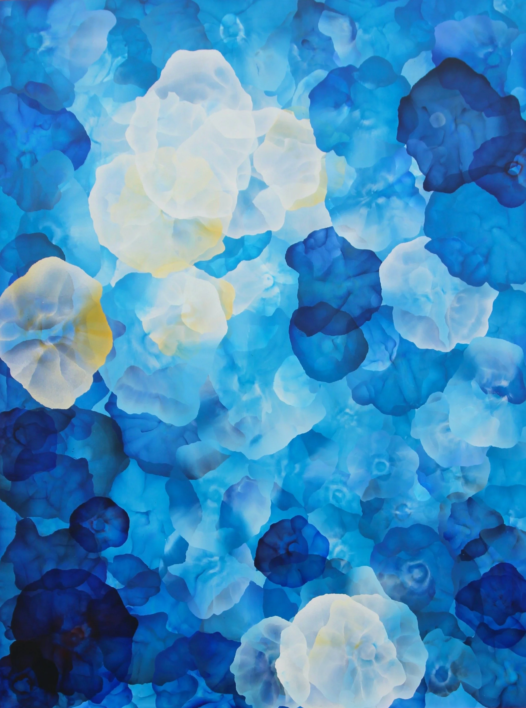 This act of the unseen revealing itself through the seen is a concept I’ve translated literally into my painting technique. Air is used to move and shape the paint and medium across the surface, creating organic forms that are sometimes opaque and intensely coloured, sometimes translucent and subtle, revealing the layers beneath. The technique is not as precise as painting with a brush and means the painting itself almost takes on a life of its own, moving where the air takes it. A mistake becomes a ”beautiful oops” that must be worked with, rather than forced into something it was never going to be. The end piece is always something of a surprise